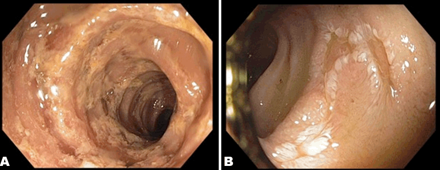 Figure 1: Endoscopic appearance of diffuse (A) Duodenal and (B) Colonic mucosal ulcerations.