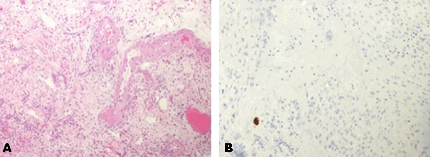 Figure 2: Presence of co-existing vasculitis and cytomegalovirus infection as evidenced by (A) Adjacent arteries showing fibrinoid necrosis of a segment of vessel wall in the small bowel, and (B) Scattered cytomegalovirus positive cells in the colonic submucosa.