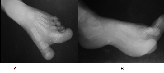 A nine-year-old female presented to radiology department for radiographic evaluation with a long history of progressive disproportionate enlargement of the medial two toes of the left foot. The overgrowth of toes was noticed in childhood which increased progressively with age. Initially it was asymptomatic but later on she developed difficulty in wearing slippers, walking with recurrent injury to the foot. On physical examination, 1st and 2nd toes of left foot were disproportionately enlarged with excessive soft tissue component on the plantar aspect. There was also widening of the web space between 1st and 2nd toes. There were no overlying cutaneous changes, pitting edema or bruit. Rest of the toes of left foot as well as right foot appeared normal. Plain radiography (Figure 2) of the left foot revealed disproportionately enlarged 1st and 2nd toes involving both bony and soft tissue components. There was increase in length and diameter of the involved phalanges with preserved cortex and trabecular pattern. There is also splaying of bony phalangeal ends with dorsal angulation; involving the 2nd toe more markedly. The overgrown soft tissue component showed increased lucency suggesting increased adipose tissue. Biopsy revealed encapsulated lobules of well differentiated fatty tissue extending up to periosteum. Based on typical clinical history, characteristic radiographic findings and histopathology, diagnosis of macrodystrophia lipomatosa was made. |