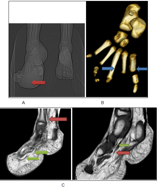A three-year-old girl was referred to our department for magnetic resonance imaging (MRI) evaluation of local gigantism of the right foot. Parents gave history of enlargement of right foot since birth, particularly the 2nd and 3rd toes for which the patient was operated at one and a half years of age in some remote hospital. There was some cosmetic improvement after the operation. However, operative records were not available at time of presentation. She had been relatively asymptomatic with only mild pain over her sole from plantar keratosis. However, in last six months parents noticed further accelerated overgrowth of her right foot including the adjacent great toe. Physical examination revealed diffuse enlargement of her right foot with exceptionally large first and third toes. Also painless non-compressible soft tissue overgrowths were palpable at the lateral aspect of ankle and plantar aspect of foot. No dilated superficial vein or vascular mark was noticed. Contralateral foot was normal. No other skeletal abnormality was found. Previously, there was plain CT scan done from outside with the patient. Plain CT scan revealed significantly overgrown right foot with overgrowth of both bony and soft tissue compartments. The overgrown soft tissue compartment was predominantly lucent suggestive of fatty nature. Both CT scan and reconstructed 3D bony images revealed enlarged and thickened 1st, 2nd and 3rd metatarsals and residual phalanges with widening of inter-digital gap. Postoperative changes can be appreciated in 2nd and 3rd toes. Magnetic resonance imaging scan of the right lower leg, ankle and foot was performed. There was increased deposition of subcutaneous fat at the lateral and posterior aspects of the ankle, posterior and plantar aspects of the heel, plantar surface of foot with disproportionately enlarged first and residual third toes. The increased fatty overgrowth had the same signal intensity as rest of the normally visualized subcutaneous fat. Streaky T1-hypointense and T2-hypointense signal intensities suggestive of fibrous strands could be observed inside the overgrown subcutaneous fat. The right tibial nerve distal part was fusiform enlarged with abundant lipomatous tissue seen as T1 hyperintense component with suppression on FatSat sequences interspersed among the thickened nerve fascicles (Figure 3). The imaging findings were consistent with macrodystrophia lipomatosa and which was further confirmed on biopsy. Based on clinical history, radiographic evaluation and histopathological examination diagnosis of recurrent macrodystrophia lipomatosa was made. |