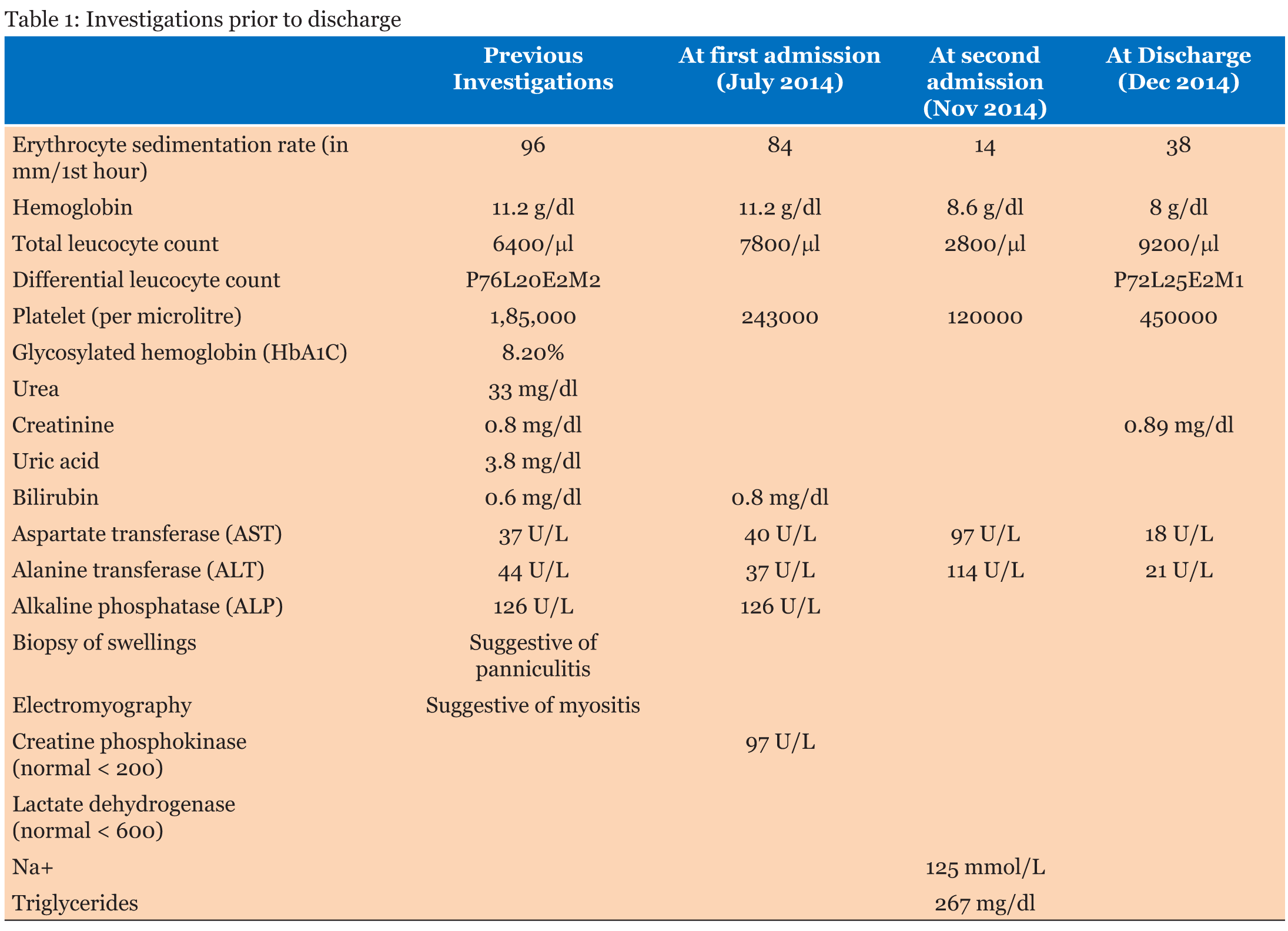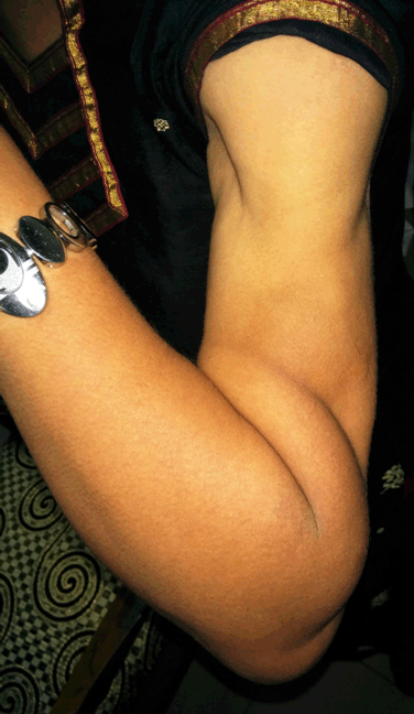 A 37-year-old female was referred to the rheumatology Clinic of our hospital in July 2014 with history of recurrent nodular swellings over face, arms, shoulders, abdomen, and legs for the past 7–8 years and a diagnosis of myositis on electromyography. Review of the history revealed that the swellings had started appearing around eight years back. They would start as a small nodule, gradually increasing in size over the next 1–2 months, reaching a maximum size of about 5 cm and would resolve by itself over another period of 2–3 months leaving behind localized atrophy at the site of the swelling without any residual pigmentary changes. Signs of inflammation (both systemic and local) were conspicuous by their absence except mild warmth to touch. She had 1 or 2 such episodes a year, and at any point of time 1 or 2 swellings at most. There would be intervening period of months without appearance of any new swelling. The swelling had been many times diagnosed as abscesses and treated with antibiotics. The patient had prior involvement of the supraclavicular region, upper arm, back, abdomen and forearm regions which had given her a muscular appearance (Figure 1). Around three years back the patient had developed diabetes and was under treatment with oral anti-diabetic agents (OADs) [gliclazide 80 mg once a day, metformin 500 mg three times a day] but control of diabetes was poor. There was no past history of tuberculosis in self or contact with a patient of tuberculosis or leprosy. She had been suggested to use insulin but never had utilized it. There was no history of any other subcutaneous drug injections or illicit drug use. There was no history of arthritis, rash, muscle pain or weakness. There were no features to suggest diagnosis of any systemic connective tissue disorders (CTD). The investigations done prior to visiting us are given in Table 1. At the time of presenting to us, the patient had swellings on the left cheek and right upper abdomen region which had been present for the last two months. On examination, the patient was a middle-aged female of average built and nutrition with a muscular appearance. General and systemic examinations were normal except for lipoatrophy over bilateral proximal limbs, shoulders and localized areas of lipoatrophy over the breasts and gluteal region. Local examination of the nodules over the left side of the face and right hypochondrium revealed swellings of 2x3 cm with poorly defined borders, firm in consistency, irregular surface and without any fluctuation (Figure 2). Based on the clinical picture and investigations present the possibilities of nodular sarcoidosis, cutaneous T cell lymphoma and lipoatrophic panniculitis [to be evaluated for cause] were kept. The patient was evaluated in view of the above mentioned differential diagnosis. The laboratory investigations are enumerated in Table 1. At our centre, Chest X-ray (CXR) was normal. Tests for Human Immunodeficiency virus (HIV) I and II, hepatitis B surface antigen (HBsAg) and antibody to hepatitis C virus (anti-HCV antibody) were negative. Ultrasonography of abdomen and pelvis was normal. The contrast enhanced computed tomography (CECT) of chest did not show any mass or hilar lymphadenopathy. Anti-nuclear antibodies (ANA) and antibodies to double-strand deoxyribonucleic acid (dsDNA) were negative. However, the complement levels were raised: C3: 187.4 (75–135 mg/dl); C4: 51.8 (13–45 mg/dL); which is usually not found in autoimmune processes. Immunoglobulin G (IgG) levels were raised: 2251.4 (620–1400 mg/dl) while Immunoglobulin M (IgM) levels were normal: 176.2 (45–250 mg/dl). Fine needle aspiration cytology (FNAC) of the cheek swelling showed only non-specific inflammatory changes and no acid-fast bacilli/granulomas were seen. The thyroid profile of the patient was normal. T3: 95.30 ng/dl (84.6–207.8), T4: 11.87 mcg/dl (5.13–14.06), TSH: 3.34 µIU/mL (0.2–4.2). Muscle biopsy done in view of the earlier EMG report did not show any abnormality. As no definitive diagnosis could be reached at this stage, she was sent back with optimization of anti-diabetic therapy. She was asked to report back in case of any new development. In mid-October 2014, the patient developed fever which was initially low grade but progressed to become high grade and continuous in nature without any response to antipyretics. This was associated with increase in the size of the nodule over the face as described previously. She was prescribed antibiotics locally without any affect. She reported to us in the first week of November 2014 and was admitted. On examination she was found to have temperature of 105°F with a toxic look, pallor and cervical lymphadenopathy. The lymph nodes were of size 1x1 cm to 2x1 cm, multiple, non-tender, discrete and firm in consistency. Systemic examination revealed hepatosplenomegaly. Investigations done at second admission are given in Table 1. The total serum iron 72 (25–170 µg/dl) and transferrin saturation 35.6% (20–55%) were normal. A repeat chest X-ray and ultrasonography were normal. The patient was started on empirical antibiotics and supportive care pending further evaluation. Fine needle aspiration cytology (FNAC) of the cervical lymph nodes was reported to be having reactive changes only. A biopsy of the cheek swelling was reported as panniculitis, but the type could not be commented. The constellation of fever, lymphadenopathy, hepatosplenomegaly, bicytopenia, raised liver enzymes, hyper-triglyceridemia and hyponatremia prompted us to think of HLH and the patient was further worked-up for the same. Retrospective examination of some of her old reports revealed that her investigations had shown bicytopenia and normal ESR during November 2009, but it was not followed up any further then. The serum ferritin levels were markedly elevated [>2000 ng/ml (normal range: 4.6–204)]. But the bone marrow examination did not reveal hemophagocytosis. However, our patient f