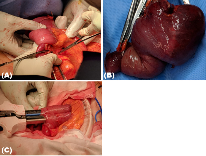 The resection was conducted at all three limbs; from proximal alimentary limb, biliopancreatic limb, and the common channel distal to the intussusception, as illustrated in Figure 3. The resections were conducted using a COVIDEN Endo GIA 80 mm x 3.8 mm linear stapler. The stapler was also used to make a side-toside isoperistaltic jejuno-jejunal anastomosis between the proximal (oesophageal) limb and previous common channel. The side-to-side anastomosis between the bilio-pancreatic limb and the common channel was also conducted using staplers. The mesenteric window was closed using 3’0 PDS. Her histopathological result showed ischemic necrosis of small bowel without any sign of recurrence of GIST. Post operatively, she was admitted to intensive care for two days. Her nasogastric tube output was minimal and was removed on fourth day. She recovered well post-operatively and began tolerating a free fluid diet on seven day.