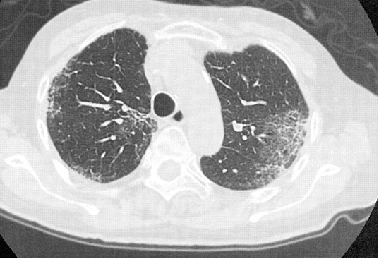 An 81-year-old woman being treated for chronic urticaria consulted our outpatient clinic with a two-week history of productive cough and fever. Six months prior to the consultation, she consulted a dermatologist and was treated with an antihistamine-1-receptor blocker against urticaria. Since her itching continued, diaminodiphenyl sulfone (DDS), 50 mg daily, was added. The chronic urticaria then gradually improved, and the DDS was continued. Two weeks prior to the consultation, she developed malaise and cough with whitish sputum. On thoracic computed tomography (CT), a bilateral upper lobe and subpleural lesion-dominant, multiple, nonsegmental, consolidative shadow was observed (Figure 1). The possibility of community-acquired pneumonia was highly suspected, and a combination of clarithromycin and ceftriaxone for one week was given at a family practice office. However, her symptoms and the infiltrative shadow on chest X-ray gradually worsened, and she consulted our outpatient clinic. On physical examination, auscultation of her chest showed early inspiratory crackles. Blood laboratory examination showed: white blood cell count 9150/μL, eosinophils 5.8% (531/μL), red blood cell count 2,800,000/μL, hemoglobin 8.8 g/dL, hematocrit 28.1%, platelet count 249,000/μL, total protein 6.8 g/dL, albumin 4.0 g/dL, AST 20 IU/mL, ALT 9 IU/mL, LDH 201 U/mL (normal range: 106–211 U/mL), Fe 76 μg/mL, ferritin 402 mg/mL, total iron-binding capacity 110 μg/mL, Na 145 mEq/L, K 4.0 mEq/L, Cl 110 mEq/L, C-reactive protein 8.3 mg/dL, CEA 1.1 ng/mL, and KL-6 197 U/mL (normal range: 0–499 U/mL). The Coombs test was negative. A bronchofiberscopic examination was also performed. Bronchoalveolar lavage (BAL) cells showed elevated eosinophils (34.1%) and total cell count (2.67 × 105/mL). The CD4/CD8-ratio of BAL cells was 3.56 (normal range: 1.0–2.0). No specific pathogen was recognized in the BAL fluid. A diagnosis of eosinophilic pneumonia was made, and the possibility of an adverse effect of DDS as the cause of eosinophilic pneumonia was suspected. Prednisolone, 25 mg daily (0.5 mg/kg/day), was then started, and DDS was discontinued immediately. Her productive cough and fever resolved, and the infiltrative shadow on chest X-ray and thoracic CT also improved gradually (Figure 2). Anemia and eosinophilia were also improved, with eosinophils of 0.2% (22/μL) and hemoglobin of 11.3 g/dL. After three months of treatment with tapering of prednisolone, the prednisolone was discontinued. Two years later, there was no recurrence of eosinophilic pneumonia.