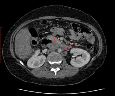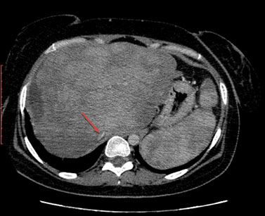 Abdominal CT showed multiple hepatic and splenic nodules enhanced after contrast injection, multiple peritoneal and retroperitoneal lymphadenopathies, and a lack of individualization of hepatic veins. The portal vein and its branches were permeable (Figure 1, Figure 2, Figure 3).