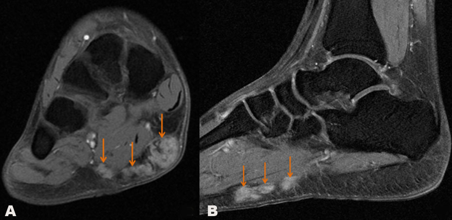 The patient was otherwise healthy and vital signs and laboratory tests were unremarkable. Magnetic resonance imaging was carried out for better characterizing. The right foot MRI was performed using a T1-weighted (Figure 1A), proton density after fat saturation (Figure 1B) and T1-weighted with gadolinium injection after fat saturation sequences in the axial and sagittal plans (Figure 2).