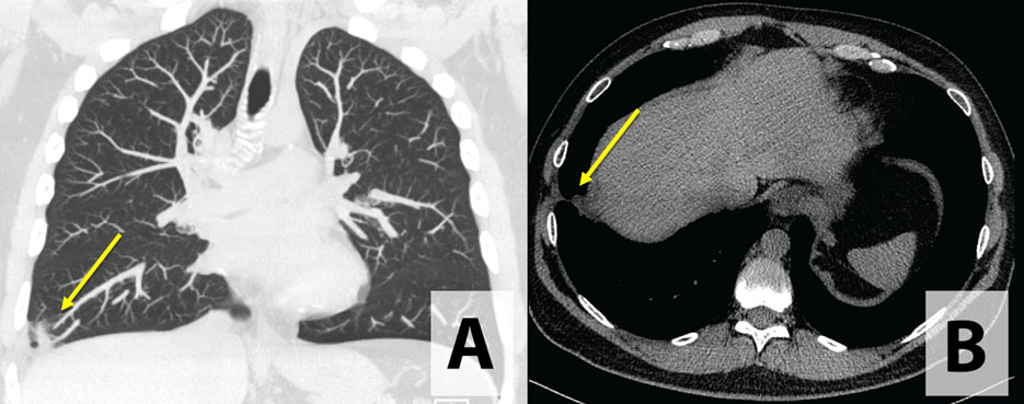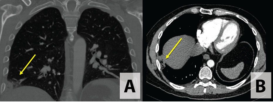 A 50-year-old non-smoking male history of basal cell carcinoma (BCC) status post-excision and gastroesophageal reflux disease (GERD) presented to urgent care with fatigue, shortness of breath (SOB), and right shoulder pain for one day. The patient was prescribed diazepam and a muscle relaxant for shoulder pain. Chest X-ray (CXR) noted a small pleural effusion on right lower lobe, and the patient was prescribed prednisone (six day course) with instructions for follow-up. Four days following this visit, the patient was seen by his primary care physician describing SOB, fatigue, and loss of appetite. The pain was noted to be intermittent and pleuritic. The patient denied any related fever, myalgia, headache, sick contacts, or hemoptysis. He described recently worsening GERD with nighttime awakenings with a sour taste in the back of his throat. As labs revealed elevated D-dimer and repeat CXR noted an ill-defined wedge like opacity in the right lower lobe (Figure 1), computed tomography (CT) chest with contrast was performed. Computed tomography chest revealed a 4 × 1.4 cm collection of fluid and gas at the lateral segment of the right lower lobe with surrounding stranding and edema (Figure 2). Differential diagnosis considered caseating abscess or necrotic tumor. The patient denied coughing, recent travel, no significant occupational, recreational exposures, or sick contacts.