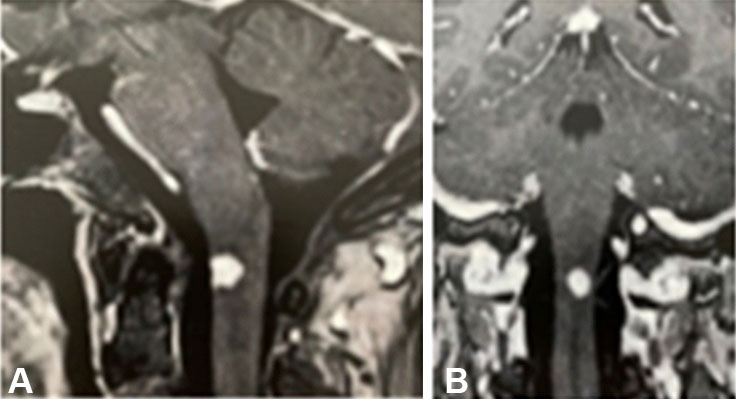 In October 2014, she started experiencing malaise, neck pain, progressive and very severe back pain, and decided to return to the hospital, where she stated, “I can barely hold a glass.” Magnetic resonance imaging of the entire spine revealed a rounded intradural and intramedullary lesion, measuring approximately 1 cm in diameter, at level C1 (Figure 2). A symptomatic treatment was prescribed, and our team recommended periodical follow-up imaging exams.