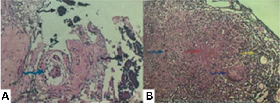 In July 2015, control MRI was done and, as the brain lesion increased slightly, our team decided to perform a craniotomy for excision of the lesion. During surgery, a hardened, little vascularized lesion adhered to the dura mater and to the cortex, and dural thickening anterior and posterior to the main lesion were observed. The microscopical aspect suggested a meningioma. However, the histopathological examination of the lesion showed intracranial granulomas compatible with TB (Figure 3). Chest CT was normal, with no evidence of pulmonary TB. After surgery, the patient underwent a drug treatment following a rifampicin + isoniazid + pyrazinamide + ethambutol (RIPE) scheme, associated with corticosteroid therapy, for two months, and rifampicin + isoniazid for seven months. The patient remained clinically stable, with improvement of pain and malaise. On periodical follow-up MRI, the intramedullary lesion was no longer visible and the intracranial dural thickening decreased.