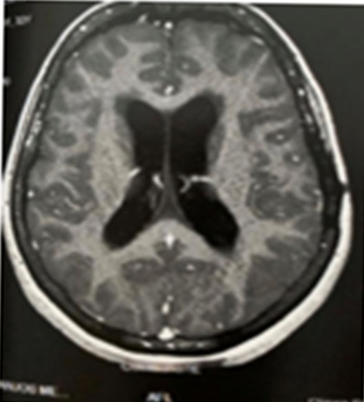 In January 2017, the patient had seizures despite the use of anticonvulsant drugs, and the doses of these medications were increased. She remained stable until May 2017, when she felt dizzy, experienced loss of balance, and had headaches. She underwent skull MRI that showed an area of cerebral ischemia of non-specific cause and slight dilation of the ventricular system (Figure 4).