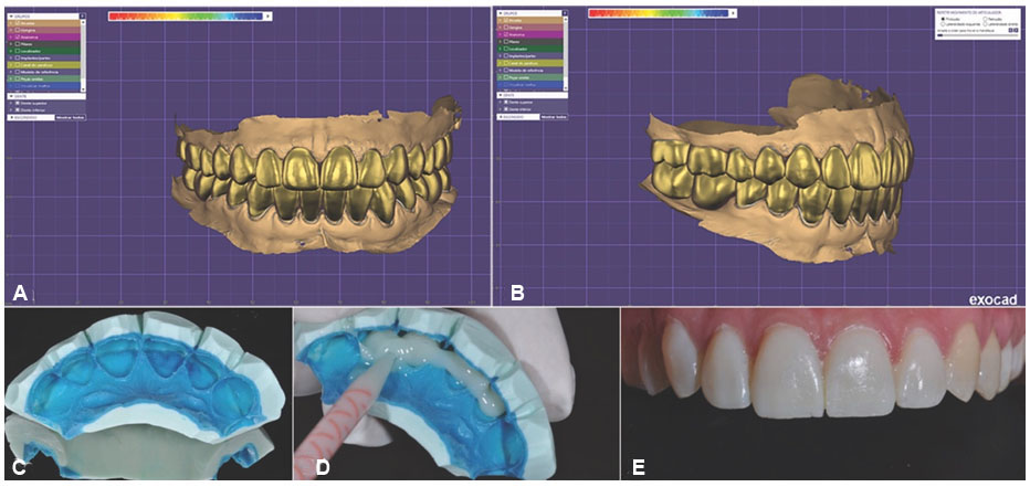 The dental arches were cast with a scanner (iTero Element, iTero Intraoral Scanner, USA) to obtain the dental template. The case was planned with a digital planning software (Exocad, Exocad GmbH, Germany) (Figure 2A and Figure 2B). The software’s user interface provides a highly interactive 3D modeling experience, allowing to maximize the productivity and reduce training costs. The CEREC system uses a chain of processes that consist of the stages of scanning, anatomization, and milling. The scan converts the prepared tooth into a 3D image (Voxels), which is sent to the computer for the anatomical definition of the piece. Once the anatomy is completed, the milling unit makes the restoration using the chosen restorative material. Thus, impressions were obtained and used for temporary restorations (Figure 2C and Figure 2D).