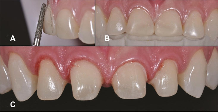 Finally, temporary restorations were produced with an acrylic resin (Vipi, Dental Vipi, Pirassununga, Brazil) (Figure 2E). The dental structure was removed for tooth preparation with a conical diamond bur (KG Sorensen, São Paulo, Brazil). To create a separation between the teeth in the proximal area, a metal sandpaper (KG Sorensen) was used to facilitate the definition of the proximal margin. Lastly, all angles were rounded, and an extra-thin and round conical bur (KG Sorensen) was used to smooth the prepared surface (Figure 3A, Figure 3B, Figure 3C).