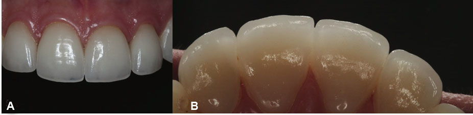 After placing the entire crown, the cervical margins were verified and the excess cement was removed with sandpaper strips. The cement line was finished and polished with a silicone rubber (Resin Finish, Microdont) and a silicon carbide brush (Jiffy Brush, Ultradent). The result could be seen in a 1-month clinical follow-up with intraoral aspects of the patient (Figure 5A and Figure 5B).