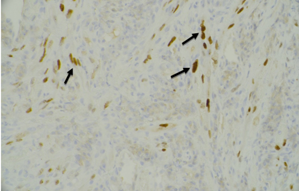 Colonoscopy revealed a normal cecum, ascending, transverse, descending, and sigmoid colon. A non-obstructing, circumferential, friable, ulcerated, nodular mass was seen from the dentate line to 14 cm (Figure 1). Multiple forceps biopsies were taken and the proximal margin of the mass was tattooed. Biopsy histology revealed ulcerated tissue with a granulation tissue like appearance, though a proliferation of bland spindle cells without increased mitotic activity was also seen (Figure 2). Human herpesvirus 8 (HHV-8) positive endothelial cells were noted within these spindle cells (Figure 3) and overall morphology was diagnostic of KS. Background rare spirochetes were identified, consistent with the patient’s known Treponema pallidum (syphilis) infection. Of note, within the mixed inflammatory infiltrate were some larger lymphocytes and increased atypical-appearing plasma cells along with scattered Epstein–Barr virus (EBV) positive cells. However, given the absence of a distinct clonal population by flow cytometry or immunohistochemistry, these latter findings were felt to be more in keeping with a reactive process rather than an EBV-driven lymphoproliferative disorder. The specimen was negative for granulomata or carcinoma.