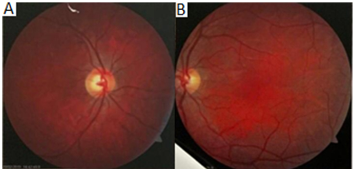 The ophthalmological evaluation consisted of the examination of ocular motility, retinography (Figure 2), magnetic resonance, and optical coherence tomography (Figure 3), all without alterations, except for the bone fractures caused by the bicycle accident. The result of the pattern-reversal visual evoked potential test was compatible with prolonged conduction time in both optical pathways.