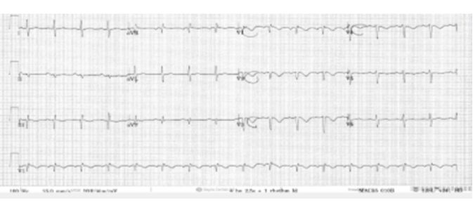 The lung fields appeared clear on chest X-ray (see Figure 1). Electrocardiogram (ECG) showed deep T wave inversion in leads III, V1 to V5 (see Figure 2). The first troponin was very elevated at 103.20 ng/L (normal reference range 0–13.9 ng/L) and the second troponin T taken after 4.5 hours was 119.20 ng/L. His C-reactive protein (CRP) was modestly elevated at 49 mg/L (normal reference range <5). His D-dimer was very elevated at 3499 ug/L (normal reference range <230 ug/L). A diagnosis of probable Non-ST Segment Elevation Myocardial Infarction (NSTEMI) with attendant acute pulmonary embolism (APE) was made.