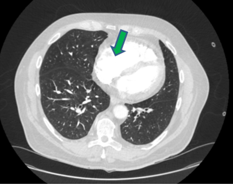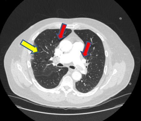 As the patient met the criteria for COVID-19, a nasopharyngeal swab was taken and a reverse transcription-polymerase chain reaction (RT-PCR) test for SARS-CoV-2 was positive. Computed tomography (CT) pulmonary angiogram (CTPA) showed significant bilateral pulmonary emboli with peripheral right-sided ground glass opacification suspicious for either COVID-19 or related to the pulmonary infarction (Figure 3). It was decided that the rise in troponin levels and ECG changes were likely to be secondary to APE rather than NSTEMI. Moreover, the right heart strain on CTPA made this more likely (Figure 4).