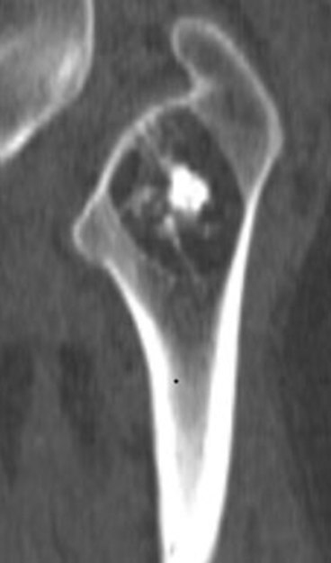 A 42-year-old man presented with a history of progressive left femoral pain radiating to his buttock. He reported worsening symptoms when walking for prolonged periods of time or playing sport. On clinical examination, he had no swelling, no tenderness, nor limitation of movement. Plain radiographs of the left hip showed a lytic lesion containing a central calcification and surrounded by sclerotic margins in the intertrochanteric region of the proximal femur (Figure 1). Axial CT scan reveals intraosseous well defined fat density lesion containing central calcification with sclerotic margins (Figure 2).