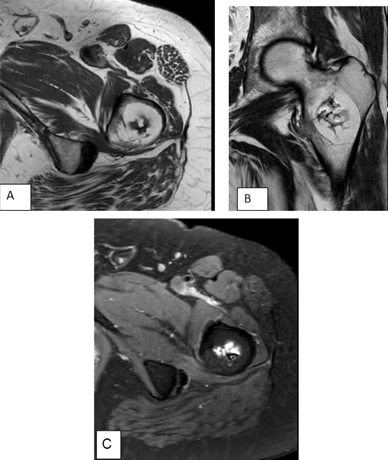 For further study, an MRI of the left hip was performed, axial MRI, T1-weighted (A), coronal T2-weighted (B), and axial T2-weighted images with fat suppression (C) showed in the intertrochanteric region of the proximal femur a hyperintense signal in the periphery’s lesion on T1-T2 weighted images, suppressed in the short tau inversion recovery (STIR) sequence corresponding to the fat, while the central part contains a space filled with fluid (low on T1, high on T2) and irregular internal low-signal-intensity area corresponding to dystrophic calcification (Figure 3). Based on the MRI results, the intraosseous lipoma was confirmed, and no other investigations were required.