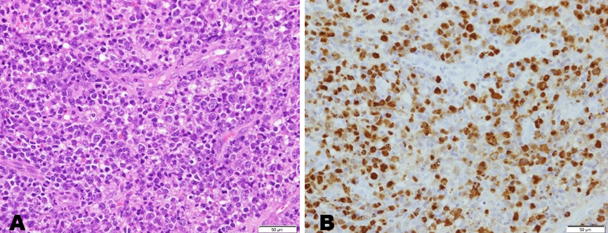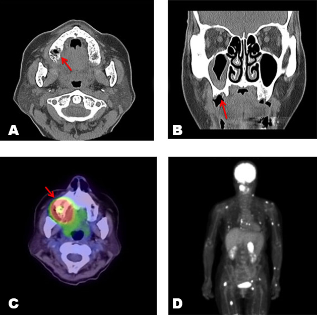 A 61-year-old woman was treated with extraction of the maxillary right first and second molars at dental clinic in August 2017. One month later, the patient was referred to Department of Dentistry and Oral Surgery, because of delayed socket healing after dental extraction. Her past medical history was significant for RA and myocardial infarction. The RA had been treated with MTX 12 mg once weekly since 2011. She had been taking cilostazol for the previous episode of myocardial infarction. There was no history of the use of other antirheumatic drugs, corticosteroids, antiresorptive, and antiangiogenic medications. At the first visit, oral examination revealed a 15 mm × 15 mm area of exposed bone with necrotic soft tissue in the right posterior maxilla (Figure 1). A reddish swelling of the gingiva was found in the surrounding exposed bone, but there was no bleeding or pain. A dental panoramic radiograph revealed absence of healing of the extraction sockets and osteosclerosis around the right upper molar. Computed tomography (CT) showed thickening of the maxillary sinus mucosa, while there was no obvious separation of the sequestrum (Figure 2A and Figure 2B). Abnormal fluorodeoxyglucose uptake (maximum standardized uptake value, 13.8) in the right posterior maxilla area was observed on positron emission tomography/CT (PET/CT) (Figure 2C). Furthermore, uptake by other organs, including the adrenal gland, multiple intrapulmonary nodules, muscles, bones, and lymph nodes was observed (Figure 2D). Blood tests revealed elevated levels of C-reactive protein (CRP, 2.01 mg/dL), soluble interleukin-2 receptor (sIL-2R, 1980 U/μL), and lactate dehydrogenase (LDH, 431 U/L), respectively. We considered the possibility of MTX-LPD and other malignant tumors, and performed an incisional biopsy in the exposed bone and surrounding mucosal tissue. Histopathological findings of the bone confirmed a sequestrum with empty osteocytic lacunae and bacterial infection, including colonies of Actinomyces spp. in the marrow space. It did not reveal tumor cells, including atypical lymphocytes, usually found in MTXL-PD. Pathological analysis of the mucosal tissue showed infiltration of numerous lymphocytes and diffuse proliferation of large-sized atypical lymphoid cells under the epithelium surrounding the gingiva (Figure 3A). Immunohistochemical analysis showed CD20+, CD3−,CD5−, and CD10− cells. Ki67+ was detected in 80% of these cells. Additionally, Epstein–Barr encoding region (EBER) was detected in almost all atypical cells by in situ hybridization (Figure 3B). Based on these findings, the histopathological diagnosis was diffuse large B-cell lymphoma (DLBCL) with jaw osteonecrosis. Therefore, we referred the patient to the Department of Hematology in our hospital. She was diagnosed with MTX-LPD based on the history of MTX therapy for RA, and MTX was discontinued immediately.