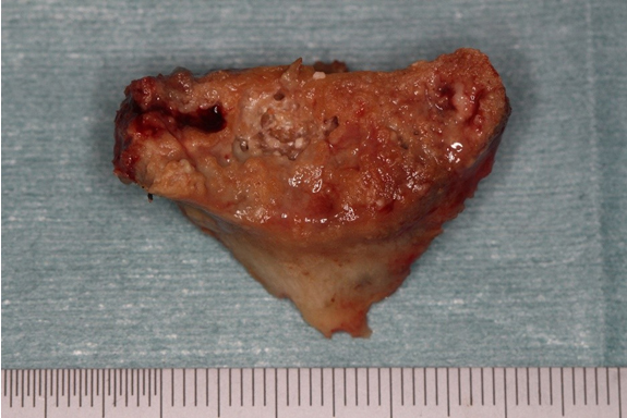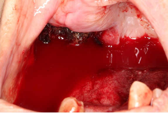 However, the lesion progressed and caused massive bleeding three weeks after the withdrawal of MTX. Therefore, she visited the emergency department of our hospital. Although the patient was conscious, a gait disorder due to dizziness was observed. Since vigorous bleeding was observed around the lesion, she was admitted to our department (Figure 4). Bleeding equivalent to class III as per the Advanced Trauma Life Support (ATLS) classification was observed [8]. The pterygoid venous plexus and posterior superior alveolar artery were considered as the blood vessels causing bleeding. Hemostasis was performed using a microfibrous collagen hemostatic material and tie-over under local anesthesia. Two units of concentrated red blood cells (RCC) were transfused since the blood tests revealed low hemoglobin (Hb) level (Hb: 7.8 g/dL). The next day, her Hb level further reduced to 6.3 g/dL, and transfusion of 2 units of RCC was added. Three days after admission, she was transferred to the Department of Hematology, and rituximab, cyclophosphamide, vincristine, and prednisolone (100 mg/day) (R-COP) chemotherapy was initiated. Doxorubicin was not used because of myocardial infarction history and cardiotoxicity. After 3 courses of chemotherapy, the separated sequestrum (34 × 23 × 18 mm size) in the right posterior maxilla was removed under local anesthesia (Figure 5). After 8 courses of chemotherapy, she achieved complete remission. Two years later, there was no recurrence of MTX-LPD, and her RA remained well controlled without MTX. Anemia was not observed (hemoglobin level 13 g/dL). Moreover, there was no recurrence of necrotic bone exposure or gingival swelling.
