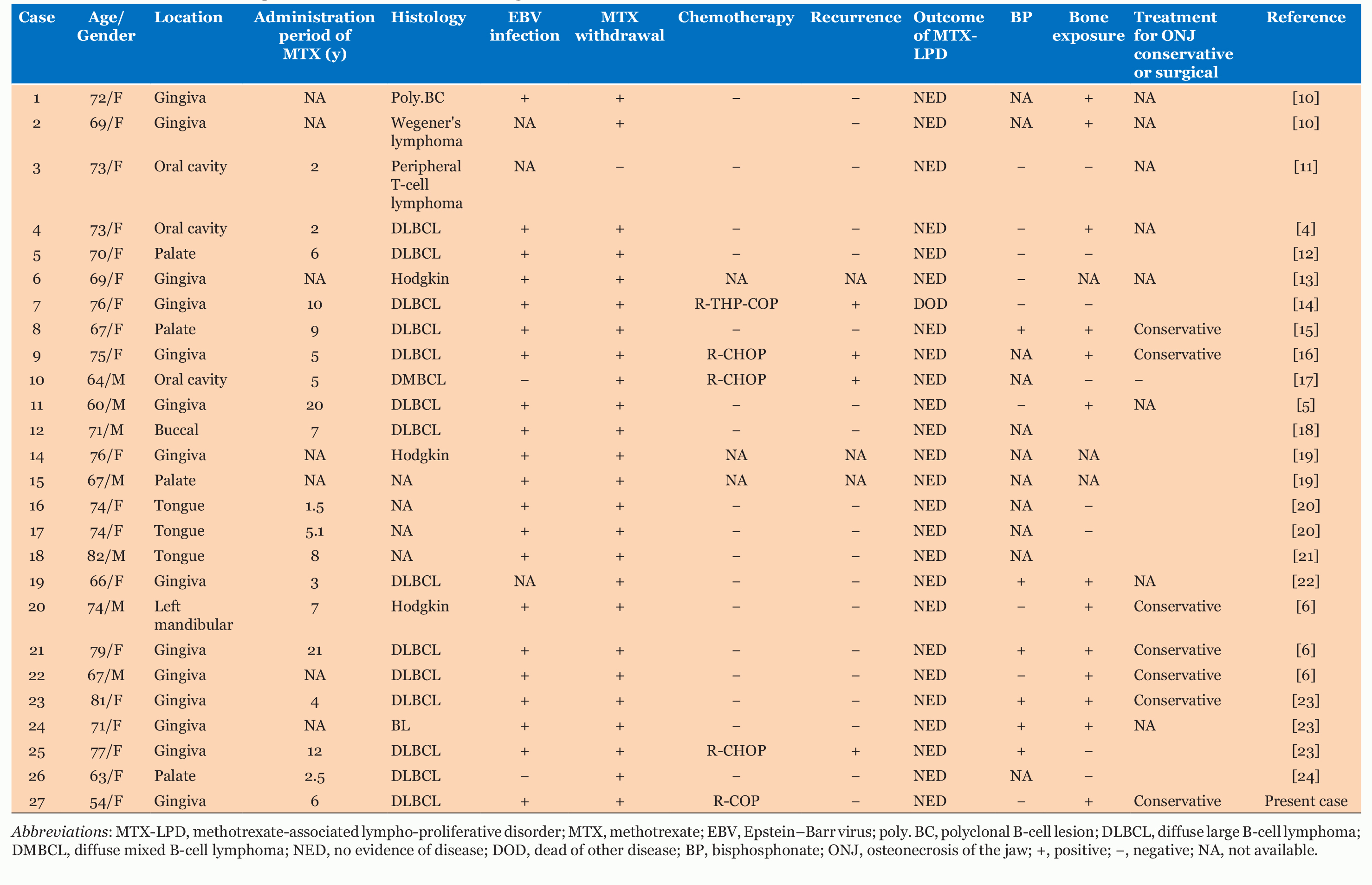 In 1991, Ellman et al. first reported a lymphoproliferative disorder in patients with RA receiving MTX, and MTX-LPD was recognized as one of the side effects [9]. Although extranodal lesions have been reported in 40% of MTX-LPD cases, cases of the oral region are relatively rare. After performing a comprehensive English literature search, it was noted that 26 cases of MTX-LPD in the oral region have been reported, and 13 of them were accompanied by ONJ (Table 1) [4],[5],[6],[10],[11],[12],[13],[14],[15],[16],[17],[18],[19],[20],[21],[22],[23],[24]. The average age was 70.9 years, and the male-to-female ratio was 1: 2.7, which was similar to the epidemiology of RA patients. The patients who developed MTX-LPD had received MTX for 1.5 to 21 years (average 7.2 years). Regarding the site of occurrence, gingiva was the most common site in 14 patients.