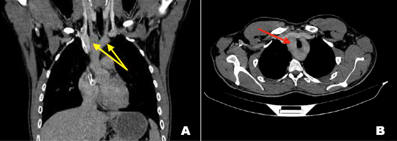 We report a case of a 27-year-old male patient, chronic smoker, presenting to our department for difficulties in swallowing evolving for several years never explored. Upper gastrointestinal (GI) endoscopy was normal. Contrast enhanced thoracic CT scan was realized showing a double aortic arch (DAA) with the ascending aorta seen splitting into the right arch and the left arch (Figure 1A). The double arch forms a vascular ring with compression of the proximal esophagus posteriorly as well as abutment and slight compression of the trachea (Figure 1B). The right and left arch have the same diameter, and each one gives rise to the ipsilateral subclavian and common carotid arteries (Figure 2). Then both arches unite posteriorly and form the descending aorta. Our scan showed no other cardiac anomaly.