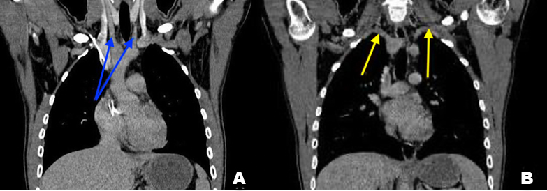 Aortic arch malformations are a large spectrum of variations and anomalies which originate from disordered embryogenesis of branchial arches. Clinically, these aberrations can be symptomless, and are usually diagnosed when imaging is being performed for some other reasons. However, it may present with severe respiratory or esophageal symptoms especially when associated with complete vascular rings [1].