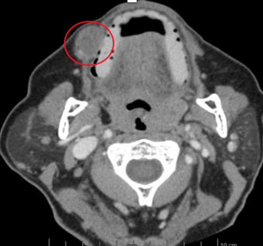 The team requested soft tissue ultrasound to determine clinical conduct. A nodule could be observed in the subcutaneous tissue of the right buccinator region, with well-defined and slightly lobulated limits, with apparent hyperechogenic bundle in its central portion, and with vascularization inside, measuring 2.1 × 1.3 × 1.4 cm. Subcutaneous cellular tissue was of normal echographic appearance and musculature was also of normal appearance and texture. The tomographic examination presented a hyperdense lesion in the region of the right buccal mucosa, between the buccinator muscle and the intraoral mucosa (Figure 2).