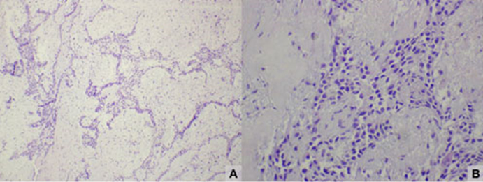 In view of this, an incisional biopsy was planned under local anesthesia. The anatomopathological report indicated pleomorphic adenoma, characterized by anatomical tubular structures and small cysts, constituted by cuboidal epithelial cells, with regular nuclei and pink cytoplasm, without atypias, amid chondromyxoid stroma with absence of malignancy and preserved adjacent glandular tissue (Figure 3).