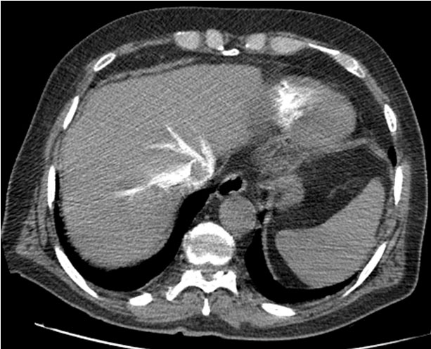 The chest X-ray showed mild cardiomegaly and a concave left middle arch. Computed tomography (CT) angiography image through the level of pulmonary trunk in the arterial phase showed the presence of low-dense occlusive intra-arterial material in the proximal pulmonary arteries bilaterally (Figure 1) and a reflux of contrast material into the inferior vena cava (IVC) and hepatic veins (Figure 2). For treatment, the patient benefitted from thrombolysis in emergency and was put on anticoagulants for up to six months with a good evolution under treatment.