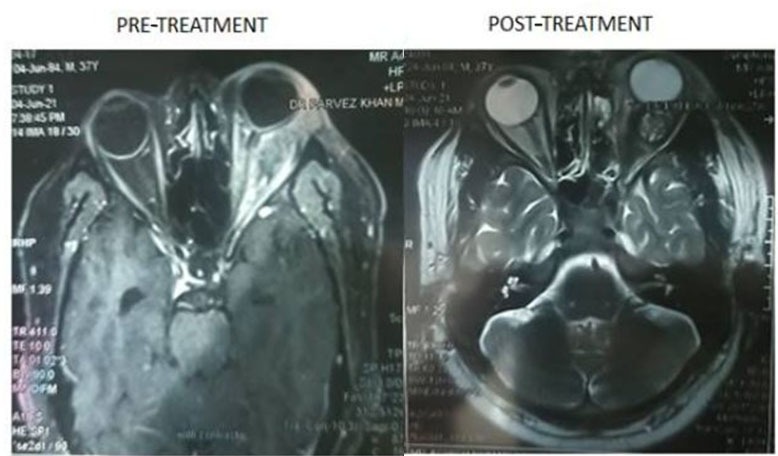 The patient was given intravenous liposomal amphotericin B injections (dose- 5 mg/kg body weight) for eight days and five retrobulbar amphotericin B injections, in dilution of 3.5 mg in 1 mL. This subsequently resulted in symptomatic improvement of the patient. The patient also underwent surgical debridement of the sinuses.