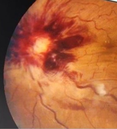 A 37-year-old male patient, resident of Kanpur presented with periorbital swelling, proptosis and conjunctival chemosis of left eye associated with left sided nasal discharge, approximately two weeks post-Covid infection. He was in home isolation and was not on supplemental oxygen therapy, but intravenous dexamethasone 1 mg BD was given for eight days. There was no history of diabetes, hypertension, cardiac disease, or any other systemic illness. He further developed diminution of vision in left eye which was progressive in nature and not associated with central nervous system (CNS) complaints.