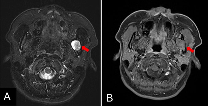 In August 2017, a 48-year-old Japanese woman visited the dental clinic because of occlusal pain in her left wisdom tooth. A panoramic X-ray showed an oval-shaped radiolucent area in the left mandibular ramus. She presented to our department for careful examination. Regarding the extraoral findings, no mass was palpable in the left mandible, and there was no dysesthesia in the left mental nerve area. Intraorally, no swelling or induration was observed inside the mandibular ramus, moreover, there was no difference between the two sides and the mucosa was a normal color. Her medical history included hyperlipidemia, iron-deficiency anemia, and diabetes. A panoramic X-ray revealed an almost circular and well-defined translucent image in the left mandibular ramus (Figure 1). Computed tomography (CT) revealed bone depression in the left mandibular ramus, and more thinning bone was seen inside. There was no obvious abnormal bone destruction. The internal density was similar to that of adipose tissue (Figure 2). Magnetic resonance imaging (MRI) revealed a lesion measuring 18×17×21 mm in size with mixed moderate and high signal intensity on fat-suppressed T2-weighted imaging in the left mandibular ramus. Gadolinium contrast-enhanced T1-weighted imaging showed no clear enhancement. Based on the clinical and imaging findings, it was likely to be a cystic lesion (Figure 3). Considering the anatomical site (it was located inside the mandibular ramus), we decided not to perform biopsy.