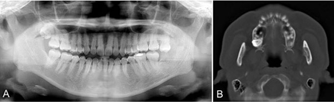Epidermoid and dermoid cysts originate from the inclusion of congenital ectodermal tissue during fetal life, or from the straying of epithelial tissue due to trauma or inflammation. The ovary and anus are the most common sites; however, these cysts may occur in various parts of the body, including the head and neck. According to Meyer's report [2], these cysts are histopathologically classified into three groups: dermoid cysts, which contain skin appendages, such as sebaceous glands, sweat glands, and hair follicles in the connective tissue, epidermoid cysts, which do not contain skin appendages, and teratoma-like cysts, which contain skin appendages, connective tissue, and respiratory and digestive tissue. There is little sex difference and most patients are around 20 years of age. Epidermoid and dermoid cysts are rare, with 7% occurring in the head and neck, 1.6% of which occur in the oral cavity [3]. The incidence in the orbits is overwhelmingly high (47%), followed by the floor of mouth (23%) and the submandibular to upper cervical region (9–24%); however, the jaw bone is considered a very rare location [4].
