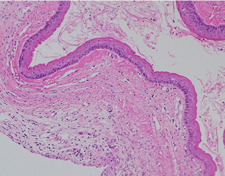 Histopathologically, the unilocular cyst was covered with thin and orthokeratinizing stratified squamous epithelium. Some parts showed mild erosion with neutrophilic infiltration in the epithelium. The cyst cavity was filled with a large amount of keratotic material, and hemorrhage, hyalinization, and mild infiltration of acute and chronic inflammatory cells were observed in the subepithelial stroma. Given the above findings, the final diagnosis was epidermal cyst.