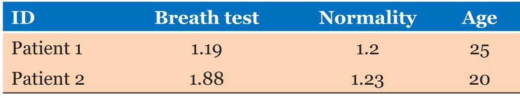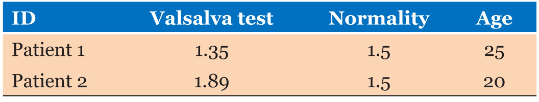 Figure 7 and Figure 8 show the Valsalva test result of patients 1 and 2, respectively. Table 4 shows the result obtained and the expected for normality according to age.