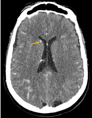 They often appear spontaneously hyperdense (75%), hypodense (22%), or isodense (3%), with post-contrast homogeneous nodular enhancement or ring-like pattern [8].