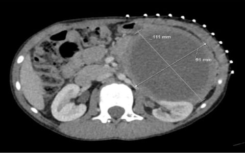 A previously well 9-year-old boy presented with intermittent left upper quadrant pain, anorexia, and weight loss over six months. His past medical history was significant for being born preterm at 34 weeks’ gestation and requiring ventilatory support as a neonate. Computed tomography (CT) scan (Figure 1 and Figure 2) showed a 10 cm encapsulated spherical mass appearing to arise from the pancreatic tail. The working diagnosis was a cystic pancreatic tumour, and he was referred for further management.