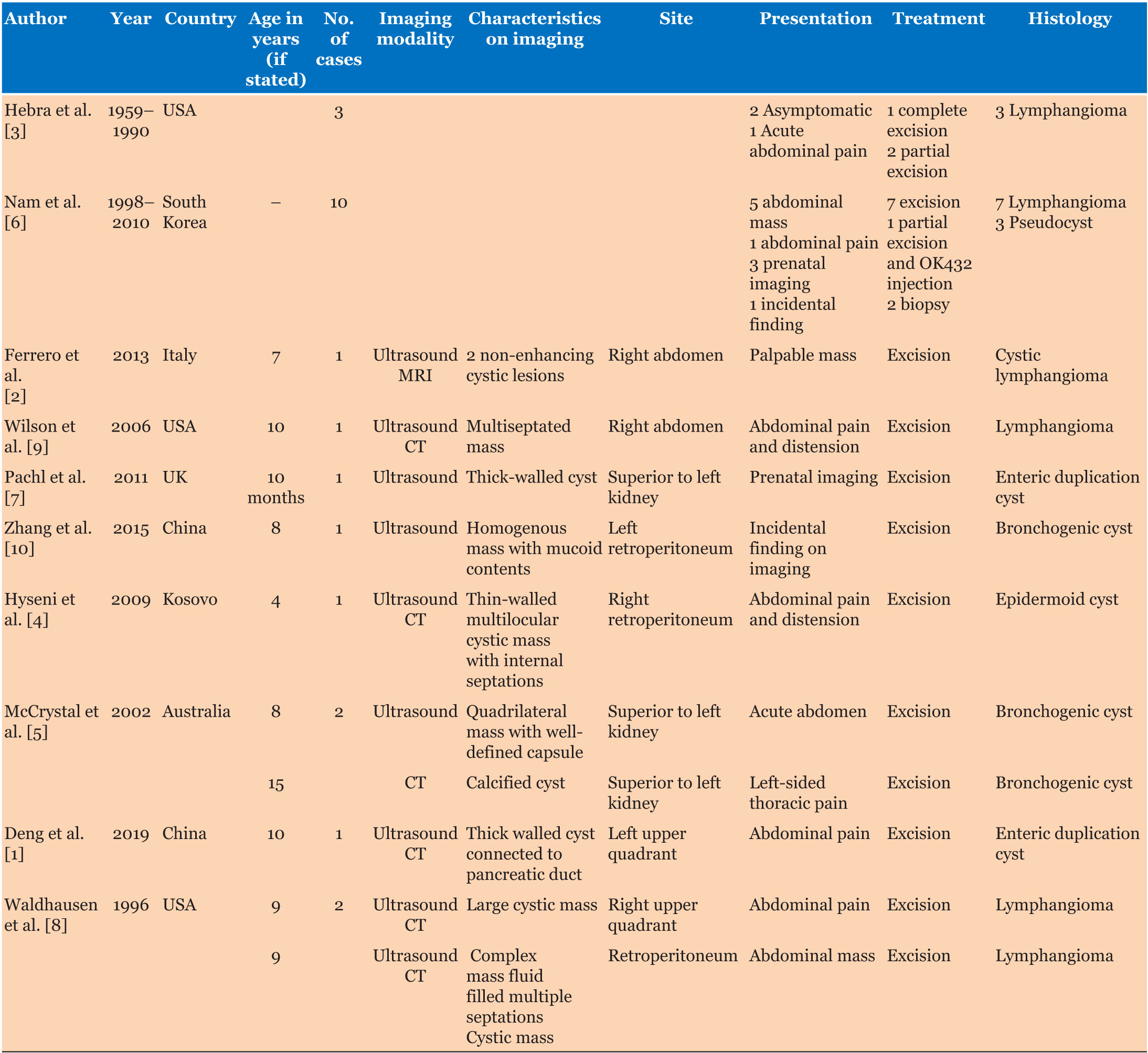 Retroperitoneal cysts are rare with few reports in children. A literature review of PubMed was performed using the search terms retroperitoneal cyst in children and pediatric population. Articles not available in English, pancreatic cysts and patients over age 18 were excluded. The results are summarized in Table 1 [1],[2],[3],[4],[5],[6],[7],[8],[9],[10].