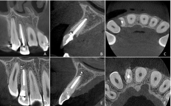 Tooth 12 was submitted to orthodontic traction with the aim of enabling the restoration, this treatment option was initially considered with the aim of not causing a gingival margin defect and preventing the percolation of salivary fluids into the root canal system. After 10 months of follow-up after orthodontic traction, radiographically showed an increase in the resorptive lesion (Figure 1B) and therefore, a cone beam computed tomography (CBCT) was requested for a multiplanar evaluation of the lesion (Figure 2). Cone beam computed tomography showed severe invasive cervical resorption, which extended apically and communicated with the endodontic filling material. In February 2020, a surgical intervention was performed to remove all the granulation tissue in the region of resorption and subsequent filling with bioceramic material (Biodentine—Maur-des-Fossés Cedex, França) (Figure 1C).