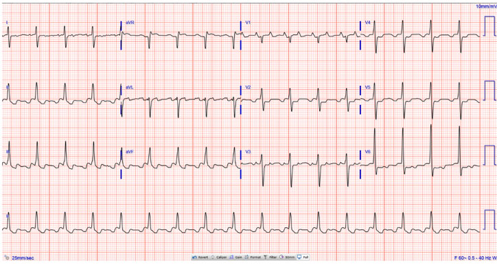 Her complete blood count and electrolytes included a potassium of 3.7 mg/dL, magnesium of 1.8 mg/dL and creatinine of 1.82 mg/dL (baseline 0.8 mg/dL 1 month ago). D-dimer was significantly elevated at 2.24 mg/L FEU (reference range (Ref): >0.65 mg/L FEU). Troponin T was modestly elevated at 0.10 ng/mL (Ref: <0.01 ng/mL). Lactate was elevated at 4.8 mmol/L (Ref: 0.5–2.2 mmol/L). Arterial blood gas revealed pH of 7.31, PCO2 54 mmHg, PCO2 88 mmHg, bicarbonate 26.7 mmol/L, and base excess of 0 mmol/L. SARS-CoV-2 polymerase chain reaction test was negative. Electrocardiogram revealed atrial flutter with variable atrioventricular conduction block which ranged from 3:1 to 5:1. Ventricular rate was consistently bradycardic (Figure 1). The narrow width of the QRS complexes suggests that these are impulses being conducted from a supraventricular origin rather than a ventricular or junctional origin. The morphology of the F waves in II, III, and aVF suggests a clockwise typical flutter. There were no ischemic ST-T segment changes. Her electrocardiogram on admission revealed atrial flutter with HR of 100 bpm (Figure 2). Chest X-ray showed no acute changes. Bedside transthoracic echocardiography showed an ejection fraction of 60% with flattened septum and new signs of right ventricular strain (Figure 3).