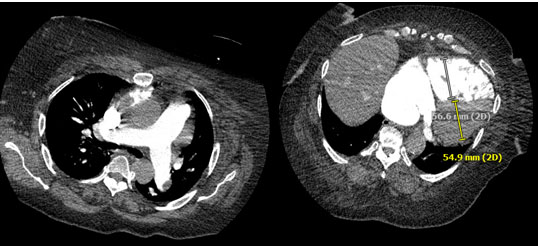 We considered septic shock but she had no fever or leukocytosis. Although patient had bradycardia instead of tachycardia, obstructive shock secondary to pulmonary embolism is considered given her risk factors (obesity and recent immobilization), new right axis deviation and elevated RVSP. We considered fat embolism syndrome; however, she did not have the classic triad of hypoxemia, petechia, and altered mental status. Her computed tomography of the chest did not reveal findings suggestive of acute respiratory disease syndrome. Further, the incidence of fat embolism is low at 0.17%, and typically due to femur fracture [7]. Bedside TTE showed normal LVEF but had signs of right ventricular strain, further underscoring this suspicion. She underwent computed tomography pulmonary angiogram pulmonary embolism and enlarged right heart chambers with reflux of contrast within the hepatic veins (Figure 4).