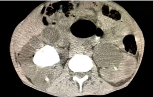 Admission laboratory tests showed leukocytosis with white blood cells of 16.160 [reference value (RV): 5.2–12.4), severe anemia with hemoglobin value of 6.6 (RV: 12–18), urea of 313 (RV: 10–40), creatinine of 8.43 (RV: 0.5–1.3) and glucose level of 124 mg/dL. He was submitted to blood transfusion and dialysis due to uremic state. Hemoglobin level increased for 9.5 after transfusion. COVID-19 test was negative. Urine culture was not performed due to the temporarily unavailable facility in our public service.