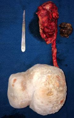 The largest vesical calculus reported in literature weighed 6294 g [6]. We report a case of giant vesical calculus measuring 17 × 13 × 16 cm and weighing 2730 g, associated with staghorn calculus in right kidney.
