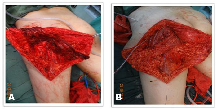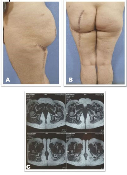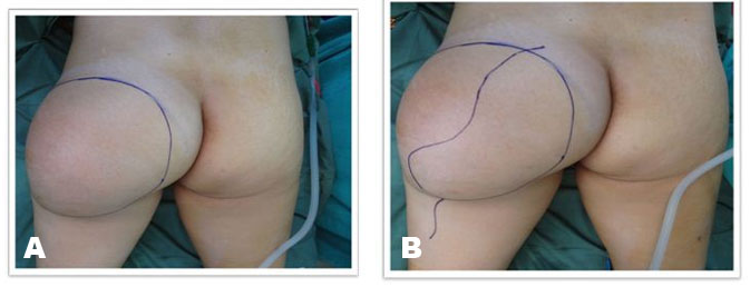 Buttock reconstruction is commonly done with tumescent liposculpture [16] or with a muscle flap cover [9]. Buttock reconstruction with tridimensional combined gluteoplasty can correct asymmetry and/or contour deformities. The combination of liposuction, intramuscular buttock implant placement, and fat transfer to the lateral third of the gluteus, corresponding to the hip and above the placed implant, is a procedure that can be performed as both primary and secondary procedure. This technique is especially indicated in patients with a limited amount of fat insufficient to achieve complete augmentation of gluteal region. Ideal patients for this procedure are the patients with significant deficits in projection and volume of lateral third of gluteus and/or hip, those with a limited amount of fat tissue available for transfer, those who underwent revision surgery, those with large defect after resection of tumor say liposarcoma, and those who desires larger average volume and projection [17].