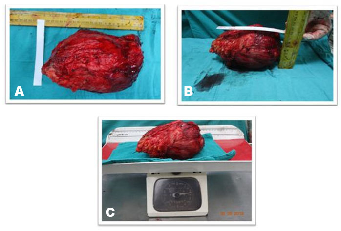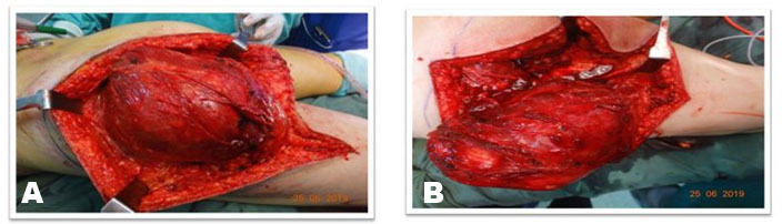 Surgical excision was planned after routine investigations. The patient was put in prone position under regional anesthesia. The skin was incised with S-shaped incision centered over the gluteal region extending 4 cm below the gluteal crease over the left thigh (Figure 3A and Figure 3B). The subcutaneous tissues were thinned out and fat was found atrophied. The fascia covering the gluteus maximus muscle was incised superiorly and the tumor was seen arising from the gluteus maximus muscle (Figure 4). At inferior margin of gluteus maximus muscle near the gluteal crease, the tumor was seen extending inferiorly into the subcutaneous fat. The sciatic nerve was identified and looped inferiorly in the thigh and was then traced superiorly. Dissection was done in the plane between the tumor and the sciatic nerve above the gluteal crease. The tumor was found indenting the nerve but the fat planes between tumor and the nerve were preserved. Complete excision of the tumor was done including the gluteus maximus muscle (Figure 5A). The exposed sciatic nerve was covered with gluteus minimus muscle to protect the irritation of nerve from surrounding structures (Figure 5B). The tumor measured 23×19×10 cm in dimensions and weighed 2.2 kg (Figure 6A, Figure 6B, Figure 6C).