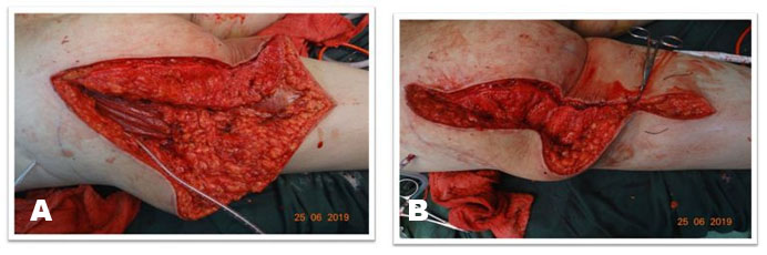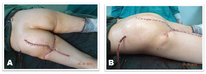 After excision, examination of bilateral gluteal for symmetry was started. Left gluteal region lacked enough support and bulk and had flattened appearance, so gluteal contouring was planned. The growing tumor had worked as a tissue expander resulting in excess skin in both horizontal and vertical directions. To achieve better gluteal symmetry, the medial skin flap was de-epithelized for 12 cm along the whole length. The adipofascial flap was then advanced and sutured on the undersurface of the lateral flap and the floor of defect to provide bulk in the region (Figure 7A and Figure 7B). To avoid dog-ear formation due to excess tissue in transverse plane, a limited skin excision was done at the level of gluteal crease. This resulted in symmetry of buttock region with better buttock contour and buttock crease formation giving an aesthetically pleasing result (Figure 8A and Figure 8B). Closure was done in layers over a suction drain placed below the de-epithelized flap which was removed on fifth postoperative day. It was followed by an uneventful wound healing with a superior aesthetic and satisfactory functional results.
