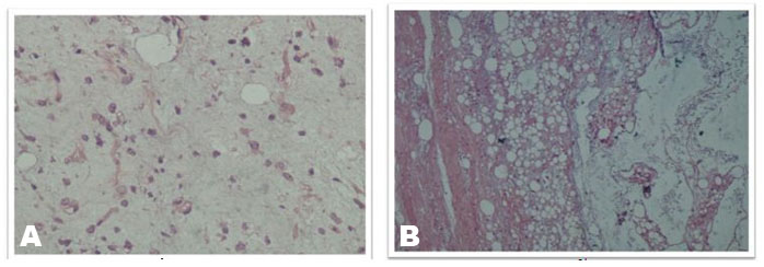 On histopathological examination, the mass was confirmed to be myxoid liposarcoma of the gluteal region. Small to large nodules composed of proliferated small bland non-lipoblast like primitive round to oval mesenchymal cells dispersed in abundant loose myxoid stroma along with several thin arborizing capillaries were seen. There were areas of abundant interstitial edema with clearing suggesting lymphangiectasia and focal areas of condensation of small round cells at periphery. Mitotic activity was sparse. The skeletal muscle tissue was largely preserved and some focal interstitial hemorrhage. The resected margins were free of tumor (Figure 9A and Figure 9B).