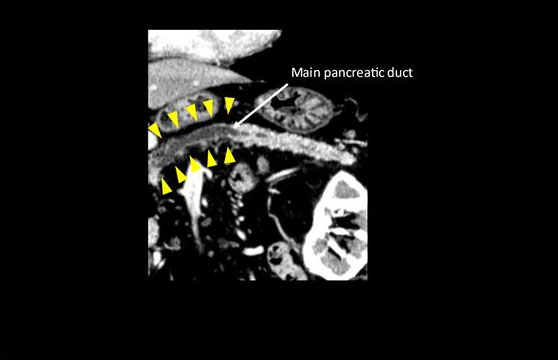 In lesions exhibiting invasive growth accompanied by prominent fatty change in the pancreatic body, obtaining the contrast effect of adipose tissue by contrast computed tomography is difficult. In addition, an association between prominent fatty change in the pancreatic body and pancreatic cancer has been reported. Therefore, we performed 3 Tesla-enhanced magnetic resonance imaging examination, which tends to yield favorable tissue contrast on adipose tissue images. To prove the usefulness of this key finding, it is necessary to accumulate related case reports in the future.