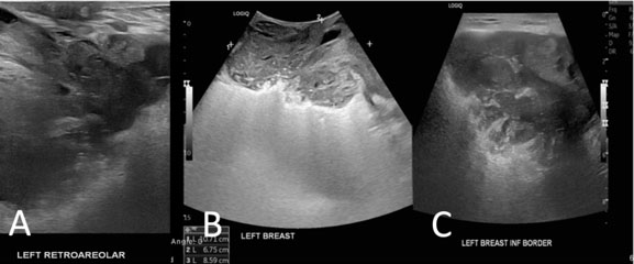 Previous work up few months ago was reviewed revealing an oval, circumscribed, heterogenous complex mass on the left breast, measuring around 10.7 × 6.8 × 6.8 cm at the left breast which is predominantly solid and with microcalcifications (Figure 2). Mammography was done revealing a large, irregular, complex mass occupying the entire left breast. An exophytic component through the lower inner quadrant was noted with diffuse skin thickening (Figure 3). Receiving hemoglobin of the patient is at 8 mg/dL which was subsequently managed with transfusion of blood products. The bleeding mass was also adequately controlled during the admission.